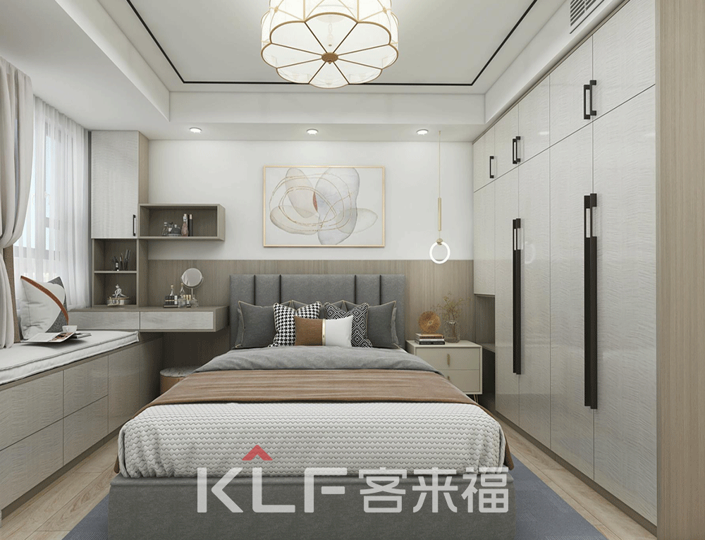 房间内的整体风格为现代轻奢风,采用黑白灰三种永不过时的颜色为底色,配以温馨的粉色,以及华贵的金色。在多种颜色的加持下,使得整个房间看上去整洁明朗的同时,更不乏温暖与尊贵。