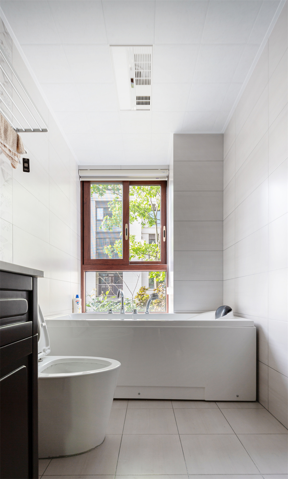 浴室中依旧是中雅胡桃色的窗户边框。白色给人的感觉非常干净利落,在窗户顶做了抽拉式百叶窗的设计,便于在洗漱时窗帘的拉起和放下,手动的也更能增加体验的感觉。