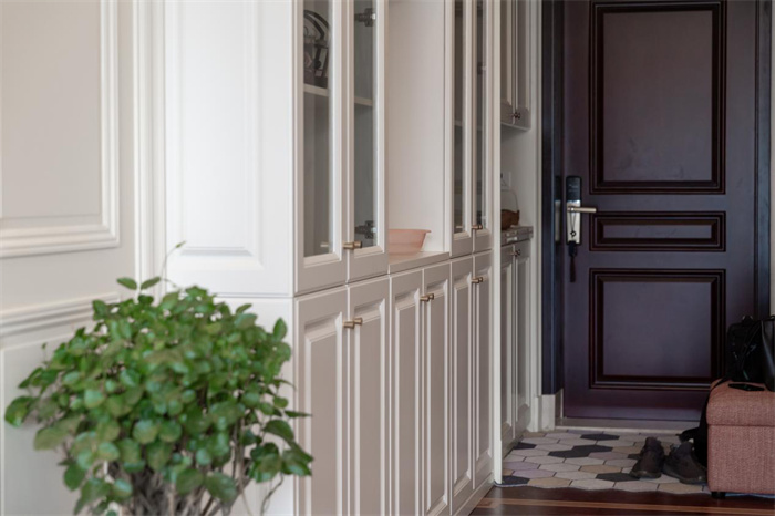 在进门处打造了整面到顶的玄关柜,门的右侧放置小巧的换鞋凳。芬兰白的玄关柜搭配膜压门板,展现出门板做工的精细和准确。金色的立体把手适应人体美学需求,在柜门关上时做了缓冲的设计,缓缓关上减少关上时的噪音。中间镂空部分安置了三到四个插座,给手机充电或者安上小夜灯,都是很方便的。
