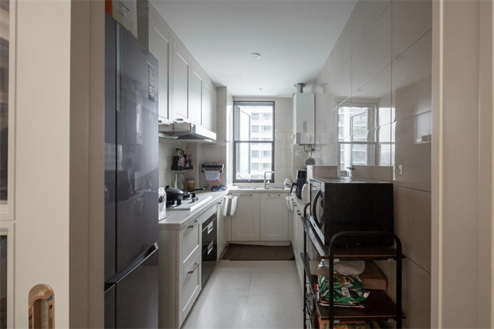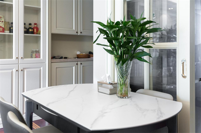 左侧便是与玄关柜相连的餐边柜,餐边柜集酒柜、收纳柜的功能于一体,最大限度发挥出产品的使用价值。芬兰白的门板颜色与透亮的玻璃相搭配,不需要额外给物品增加神秘感,想要的东西拉开柜门便可以拿到。餐边柜中间部分上方的围栏设计,放置石膏雕像增加空间内的艺术感。厨房:厨房处一眼望去整体空间内物品、柜体很齐全,但是显得略微有些拥挤,容纳一到两个人在厨房里忙活已是足够 。