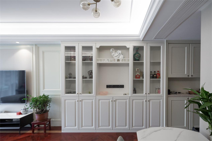 电视背景墙以电视柜为中轴线,两侧打造对称的石膏线门板的设计,将背景墙连成完整的一面,与右侧的餐边柜花纹样式相一致,在视觉上形成连贯的效果。电视柜采用的是成品家居,黑白灰三色的搭配简约却不失格调。顶部射灯的光线向下投放,如伞状。