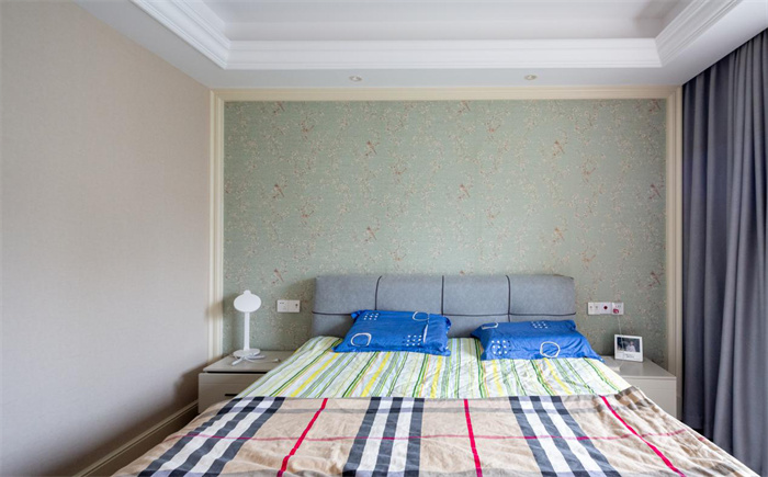 厨房整体是U型的结构布局,左侧为做饭的地方,上方打造了到顶的橱柜,下方安置了消毒柜。橱柜上方安置了把手,运用的阻尼轨道抽拉的设计,拉开之后再合上就不要太过于用力,顺着轨道慢慢就可以完全的闭合。右侧为放置热水壶、饮水机的平台,中间为洗菜的位置,整体功能相对而言很齐全。但是要注意东西摆放的位置,不常用的物品放在较高的橱柜里面,常用的放在收纳架上,可以减少日常拿物品的烦恼。卧室:基于主卧内的位置和户主平时的喜好需求,背景墙采用的是薄荷绿碎花系的背景,透露出如春天般清爽 的气息,相同色系的薄荷绿和棕色,随着光线变化展现出不同的柔和质感。由于床占据了卧室内相当大的部分,所以在卧室门处打造了一个内置衣帽间,层层的收纳架摆放将衣物和杂物有序的摆放,与衣帽间相反方向为卫浴间,满足了日常生活的需求。