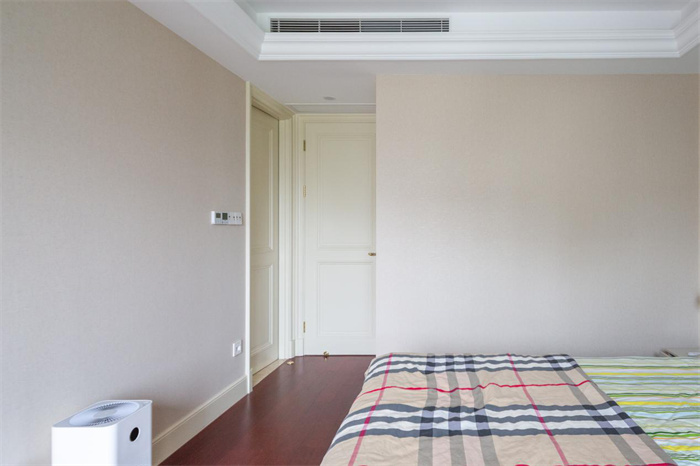 次卧与阳台相连接,使得整体的光线更加透亮,实现了在早晨起来便能感受到来自外界的第一缕光亮。与主卧处颜色搭配相反,床铺使用的是相应的淡绿色,背景墙采用的是棕色。一侧整面到顶的衣柜,两开门的衣柜设计,精美的膜压门板花纹,给空间增添一丝层次感。金色的立体把手减少了拉开门时的阻力。在打造的时候要注意衣柜与床铺之间的距离,避免拉开的时候与床边相碰撞。