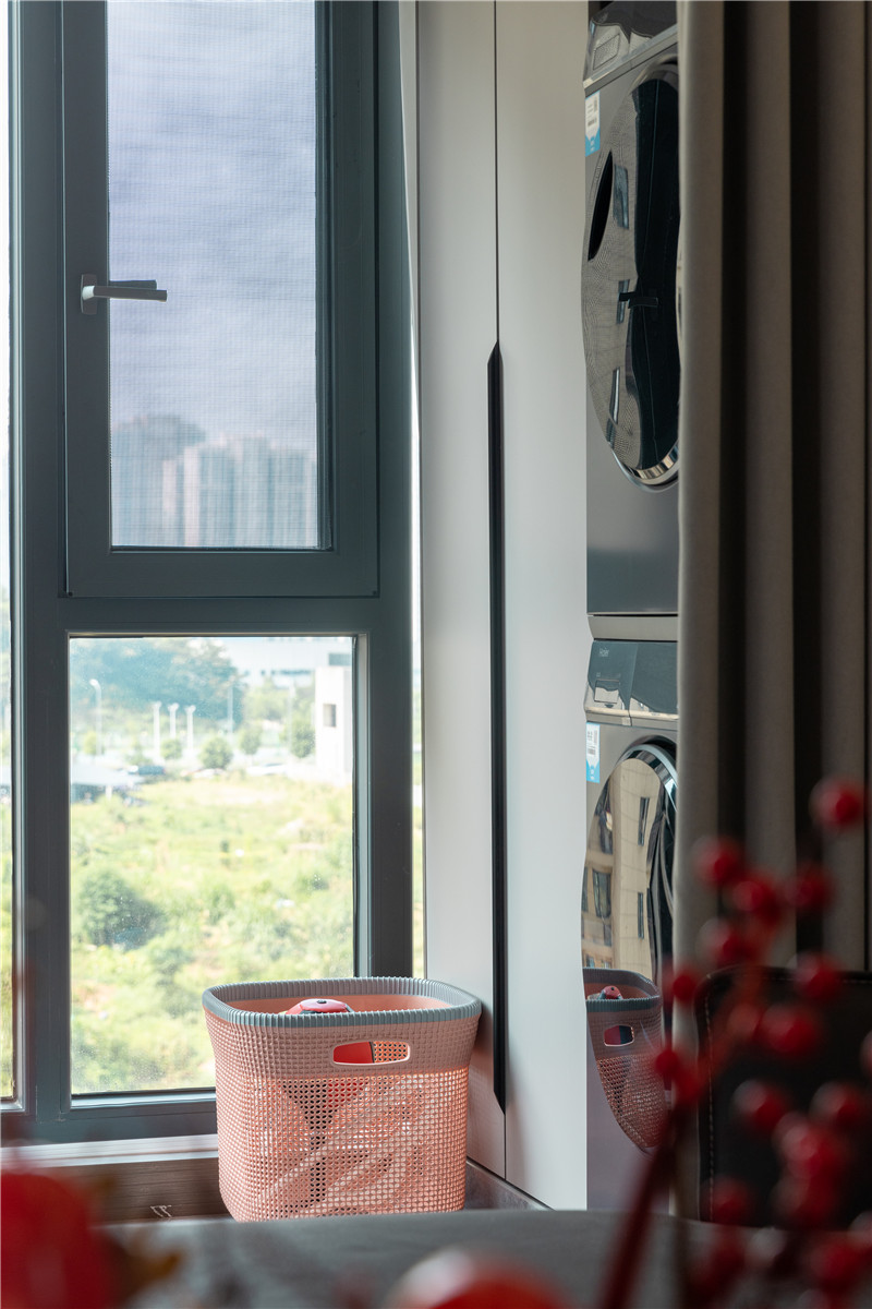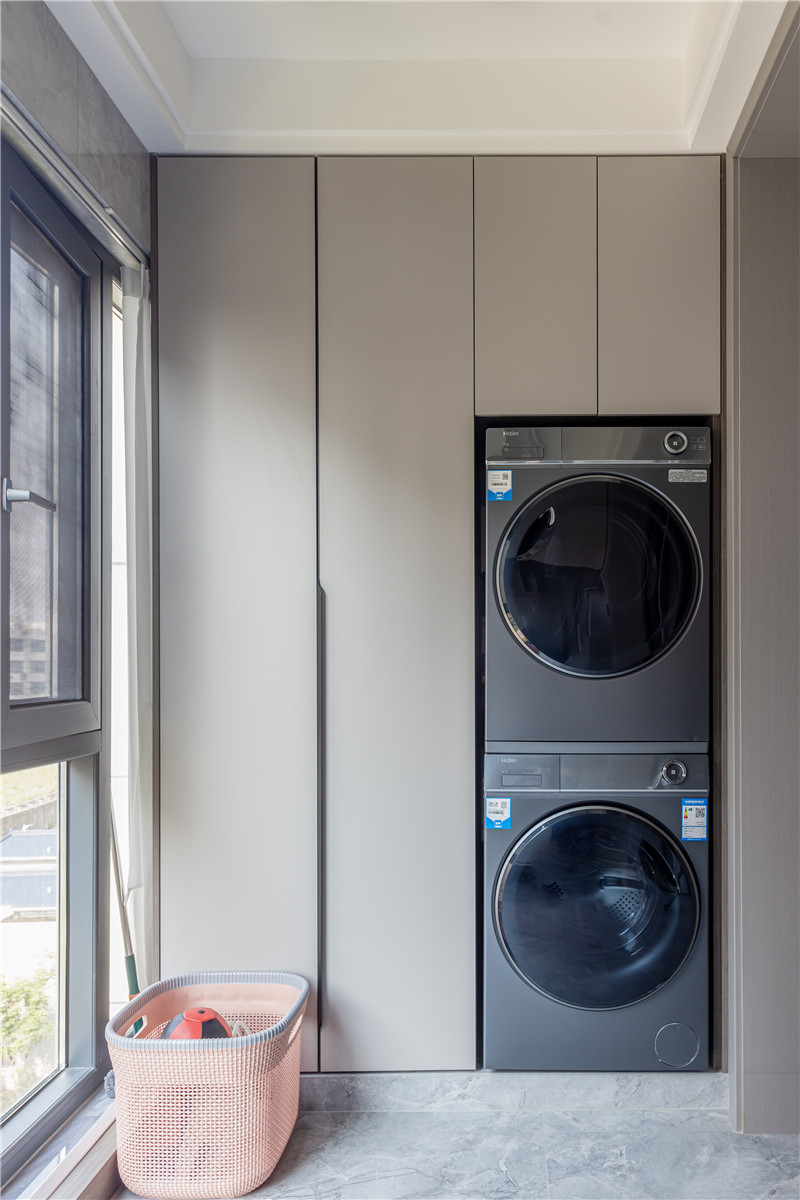 在这户案例中,收纳需求和居住的舒适性是屋主所追求的。所以在阳台空间上,屋主与设计师也通过两组柜子让家变得更干净。一侧做家政柜嵌入洗烘家电,到顶高柜内部分区合理,很实用。