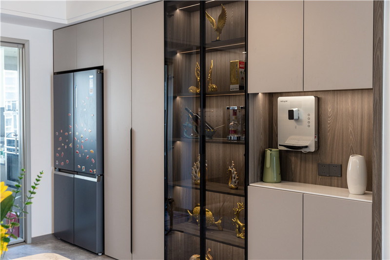 餐边柜留出冰箱位置做一体化设计,中部做半透茶玻用于展示藏酒与摆件,侧边柜中部掏空做置物台可以放置小家电和生活物品。整体餐边柜的设计功能性很高,在实用的同时注重各分区的比例,给人更精致的感觉。