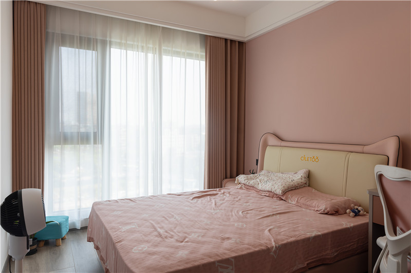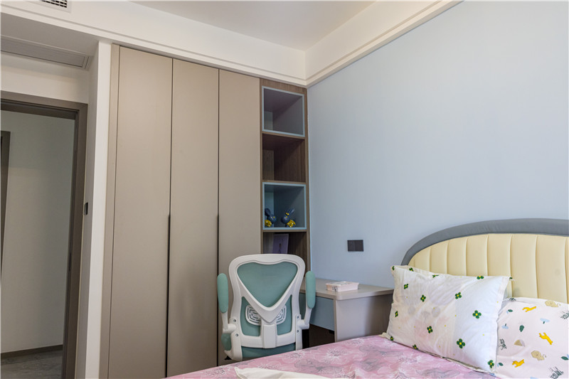 在女儿房的设计上,屋主以粉色调和蓝色调塑造了两间次卧。在次卧中,除了日常生活的睡眠区,在衣柜设计中加入了书桌的元素,让衣柜与书桌一体化设计,开放格可做书柜使用,整体和谐又节省空间。