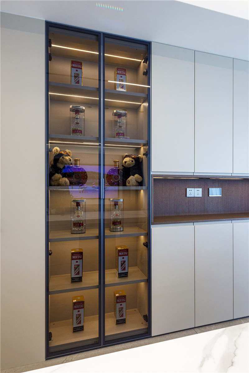 在沙发背景一侧,米兰·(milan)用一组岛台与餐桌的设计形成空间上的划分,沿着墙壁走势设计的酒柜与次卧门齐平,这样整体做嵌入式的柜体收纳会让空间显得更轻盈。半透茶色玻璃柜门也很好地展示了藏酒与工艺品,彰显屋主的生活格调。