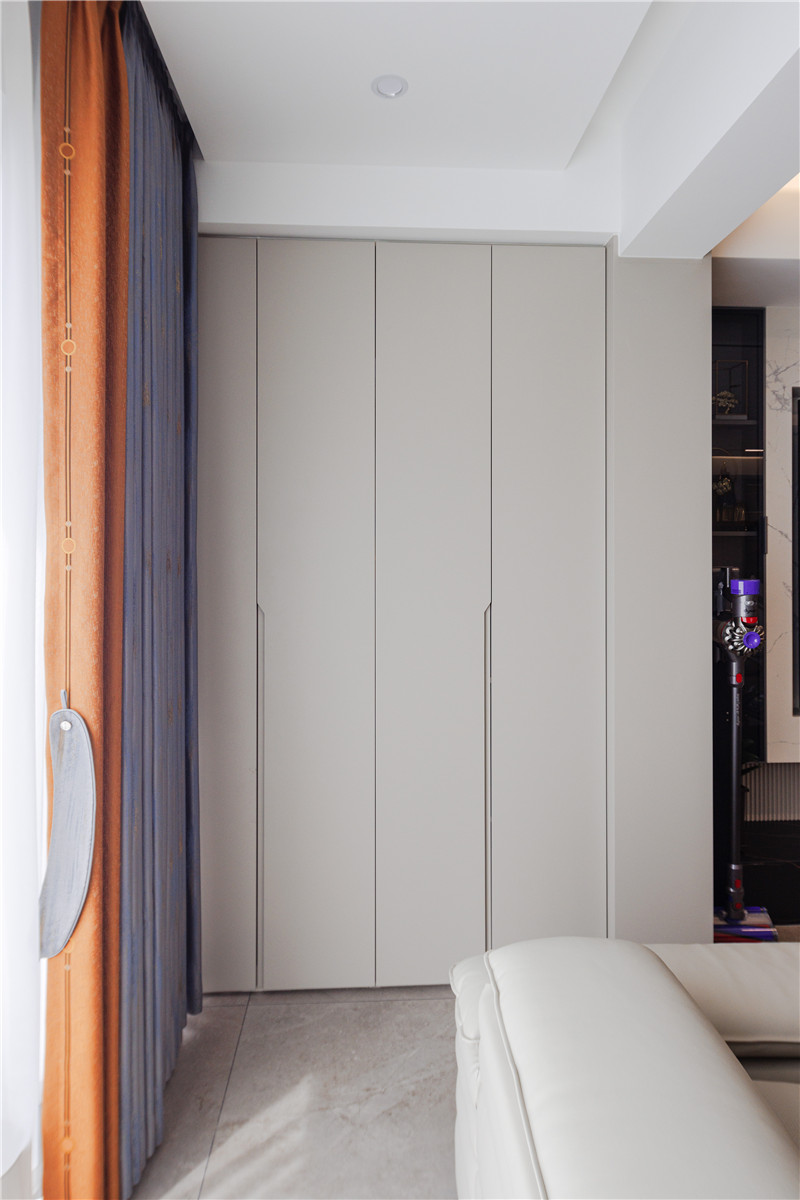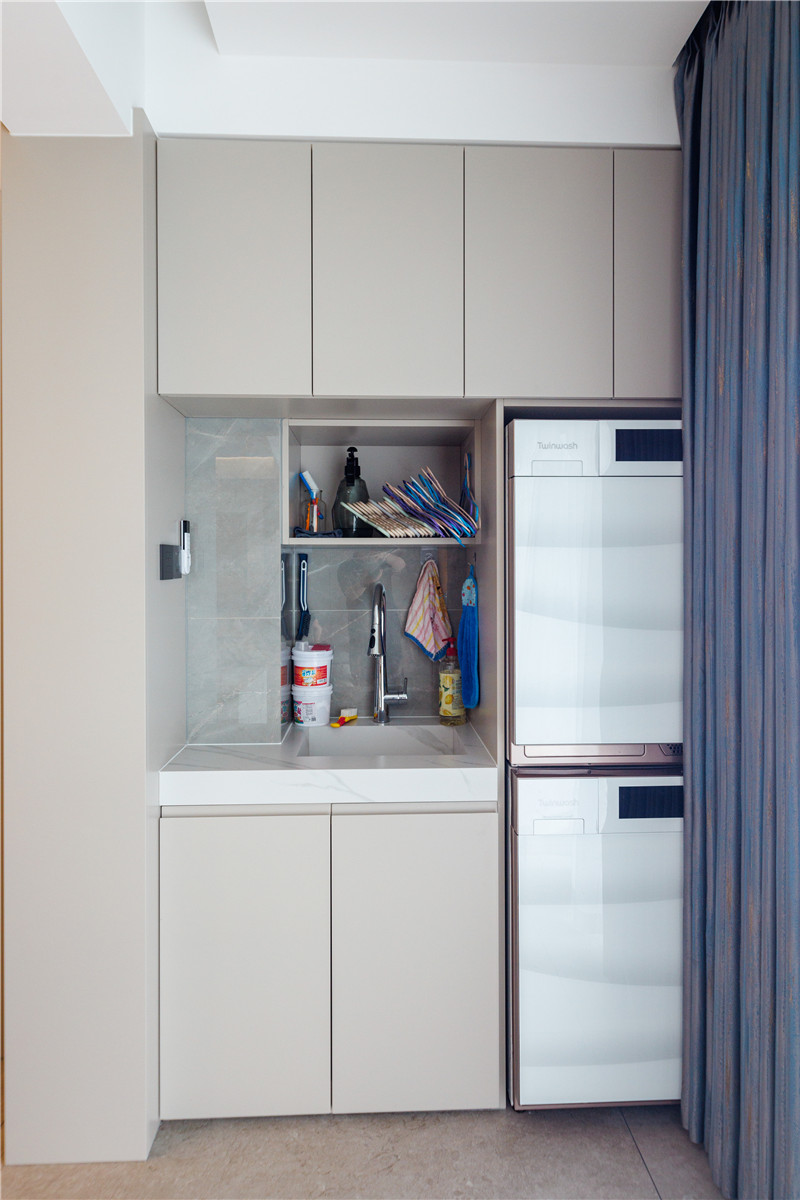 简约风格的家更注重功能,两侧阳台柜一个做家政柜使用,一个做洗衣区,分区明晰,在无序的生活中以整洁有序带给家更多美好。