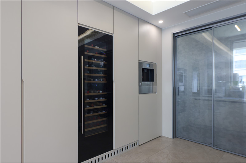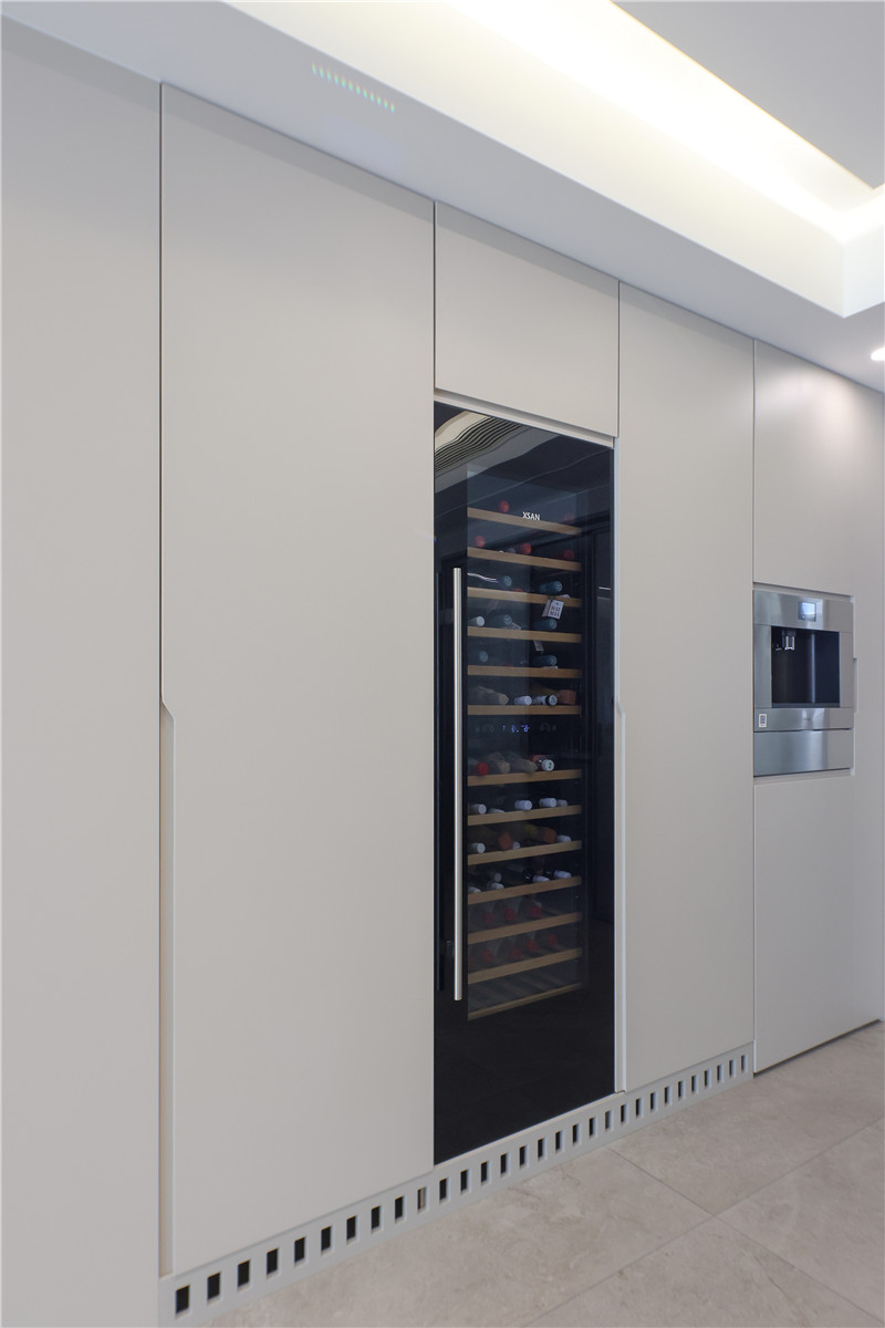 靠墙做整面餐边柜,将冰箱嵌入其中,隐藏式设计更美观。无把手的整面高柜给人简洁视觉体验,不管是铣型拉手的细节还是板材的接缝处,都将工艺做到尽善尽美。