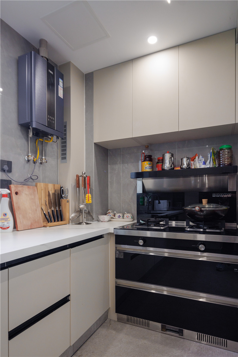 厨房里藏着一日三餐的爱意。厨房采用U型的整体布局,多层板柜体搭配水漆柜门让橱柜更坚实耐用。