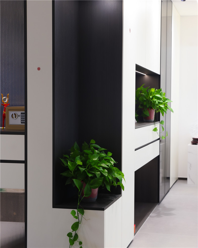 玄关柜做薄侧柜,视距上弱化衣柜的厚度,可收纳可摆放装饰物;整体射灯与条带灯组合设计,让玄关不失美感;穿插设计,营造悬浮美感。