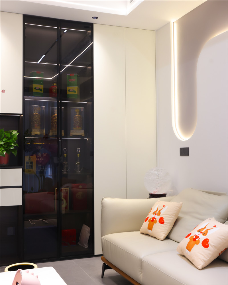电视背景墙整体挑高处理,内嵌电视机,“躺平”式观剧一整个爽住,还方便卫生清理;沙发背景墙做圆弧造型颇富艺术感,配以灯光的运用,氛围感跃于空间。