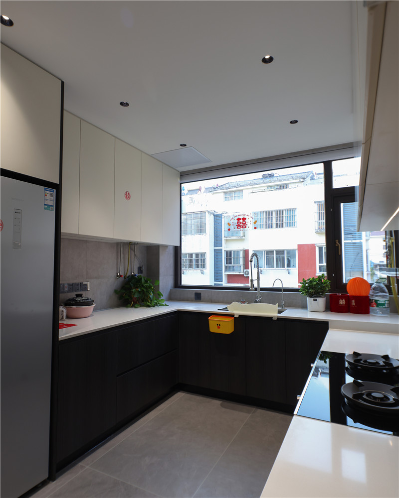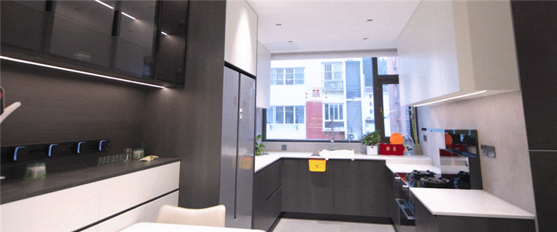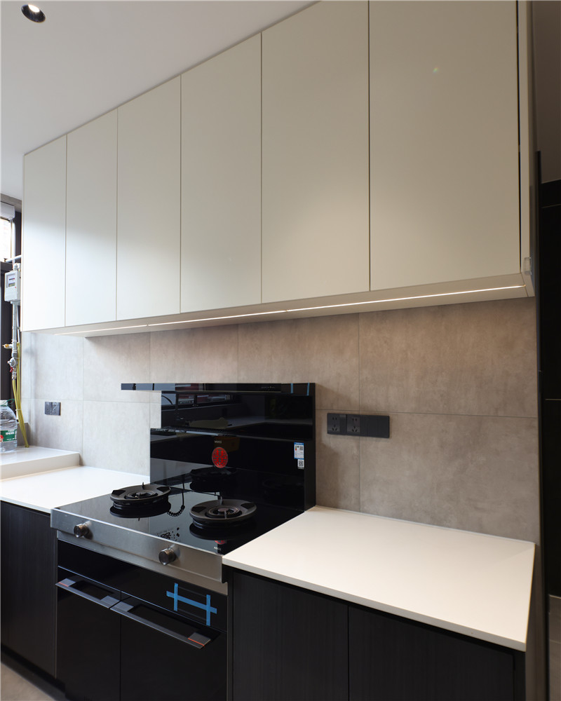 厨房U字型布局,遵循洗→切→烹→盛的动线,便捷且收纳力强;橱柜箱体及吊柜采用无拉手设计,视觉清新;整体台面岩板运用,耐磨防渗水;冰箱与柜体组合,协调整体空间布局。