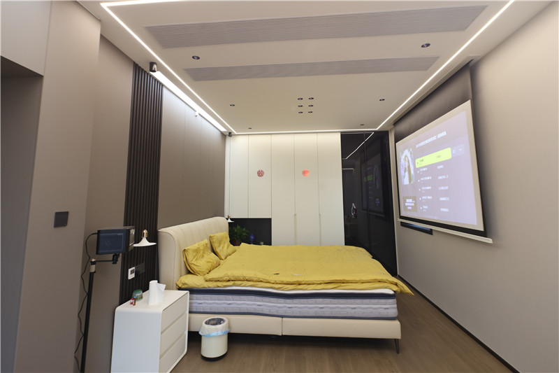 卧室一侧整面立柜,配合铣槽拉手简约利落;梳妆台抬高设计,融入圆弧造型,典雅温柔;整体空间主灯与辅灯相结合式设计,空间层次感强。