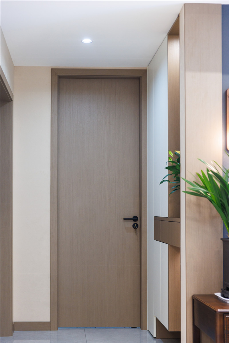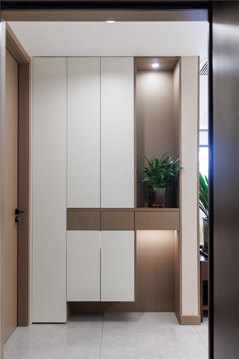 玄关柜设计遵从简单设计手法,选用科技直纹与兰迪白作拼色设计增添时尚感,让空间不单调;门墙柜一体化选用米兰·(milan)科技直纹,更加自然百搭。