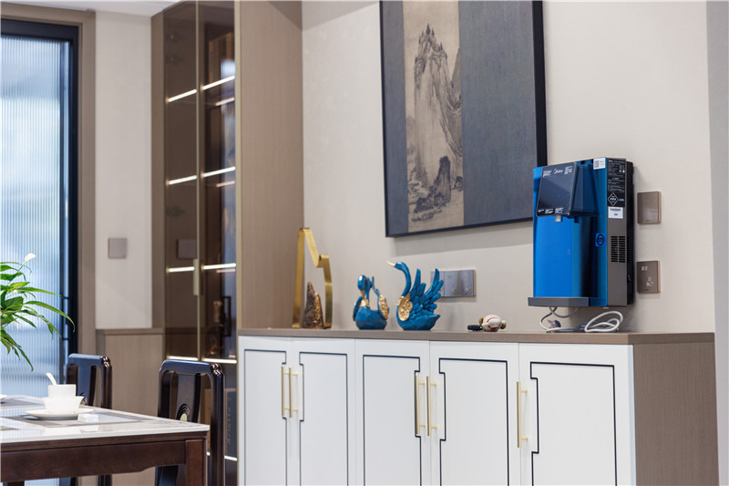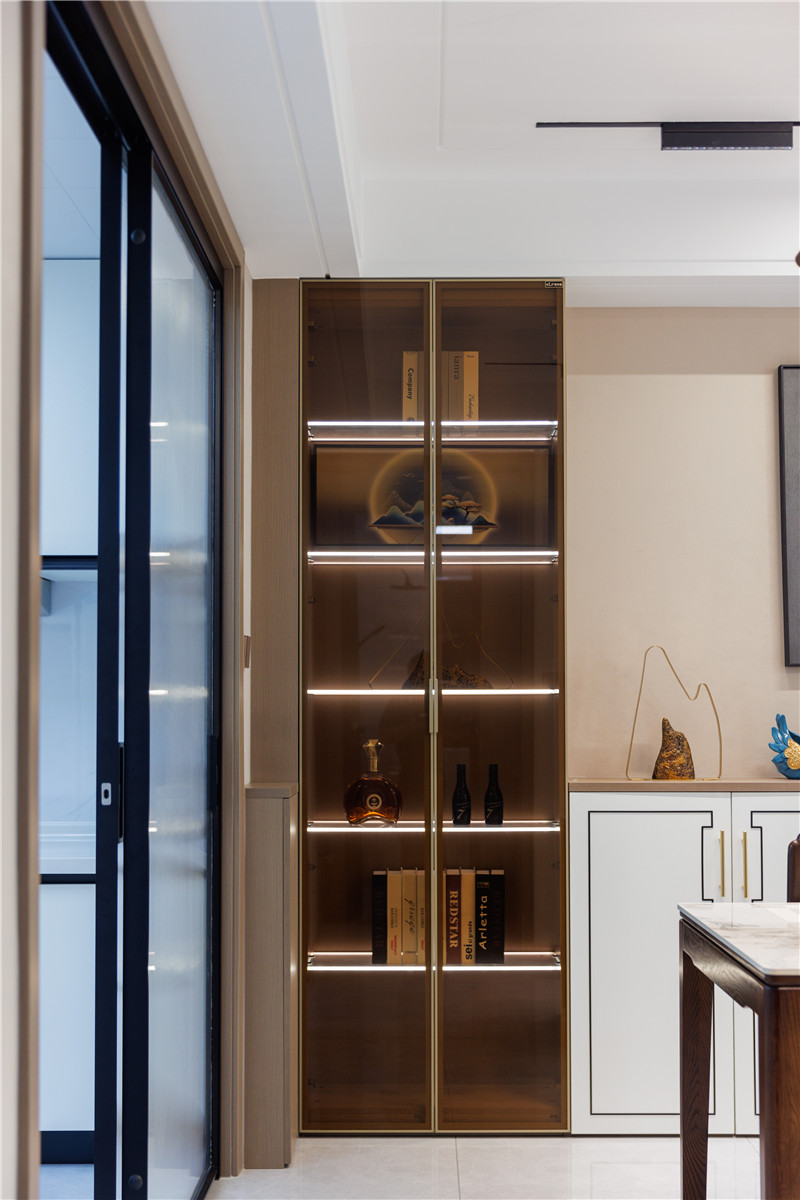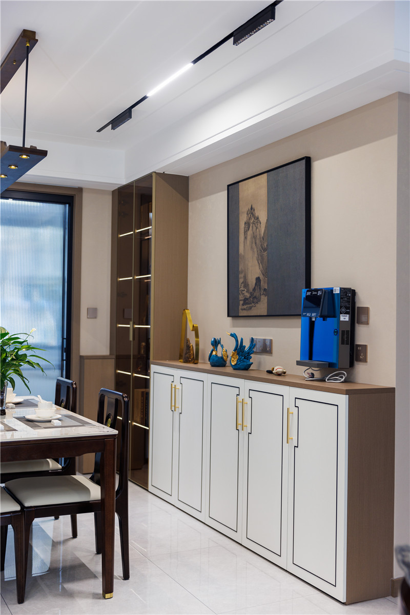 餐边柜设计选用了矮柜+2组玻璃高柜,矮柜具有浓烈的中式风格,黑色方形刻线+金色拉手,既大方美观又简单高雅;玻璃高柜的选用,为餐厅增添一丝奢华氛围。