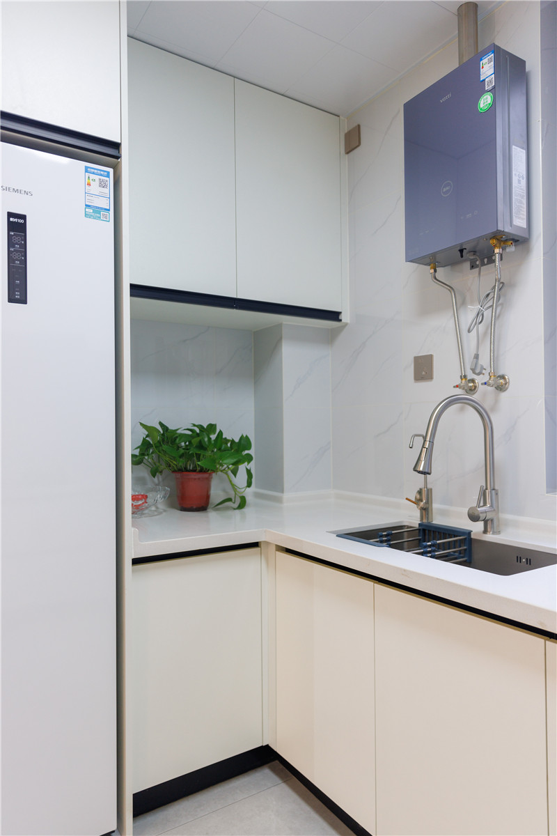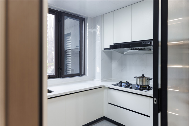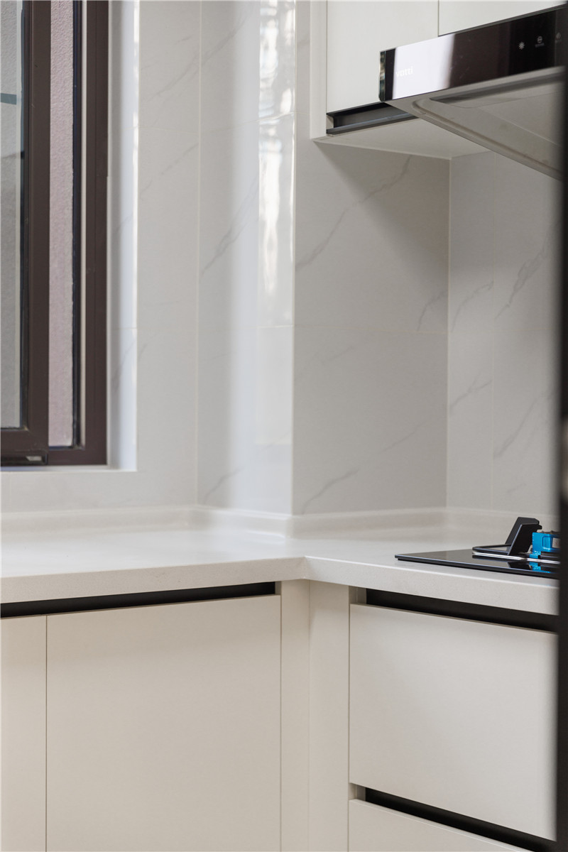 厨房面积有限,选用U型橱柜设计合理的运用空间,兰迪白与免拉手设计,使得空间简洁干净,符合厨房应有的基调。