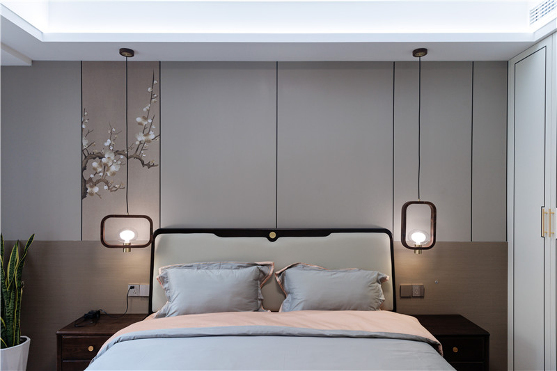 背景墙不规则的现代设计与中式古画的理想糅合,再配合新中式床头灯,整体既清新古风,又符合现代人审美。