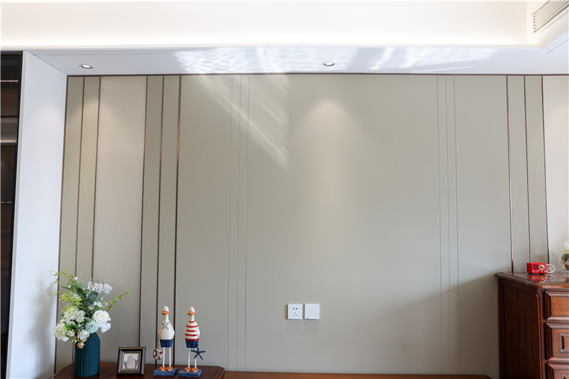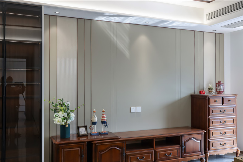 电视背景墙采用整面浅杏色背板,配以金属色长线条,彰显时尚感;电视柜为一字型组合柜+独立柜,深褐色满满的中古气息,其实古铜样式拉手与造型柜门组合,拥有高级质感。