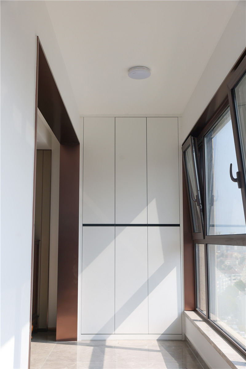 阳台一侧做小型洗漱区,有效避免上班、上学的洗漱时间冲撞,底部预留区可放洗衣机;一侧做整面到顶柜,可作为换季衣物存放区;此空间柜体需注意柜体耐黄化及防水性。