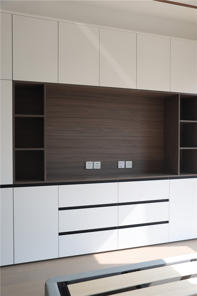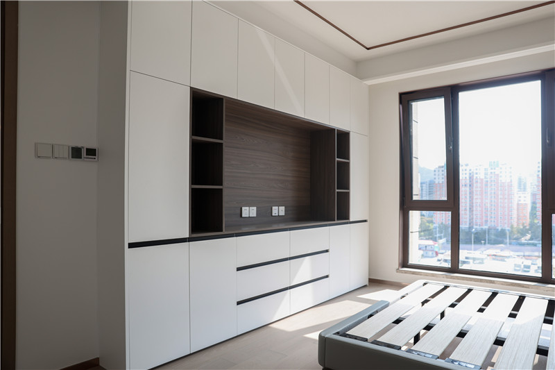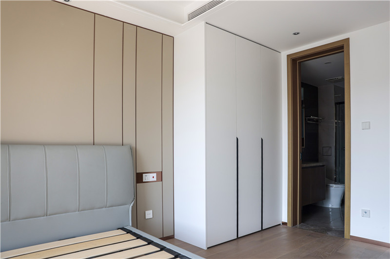 主卧:采用客厅同款背景墙,两侧预留插座为床头灯或日常使用;衣柜与电视柜组合,纯白与橡木色映衬,使得空间简约而不简单;一组整面到顶衣柜,内部合理分区进行有序收纳。