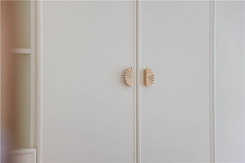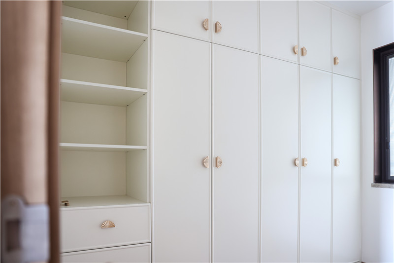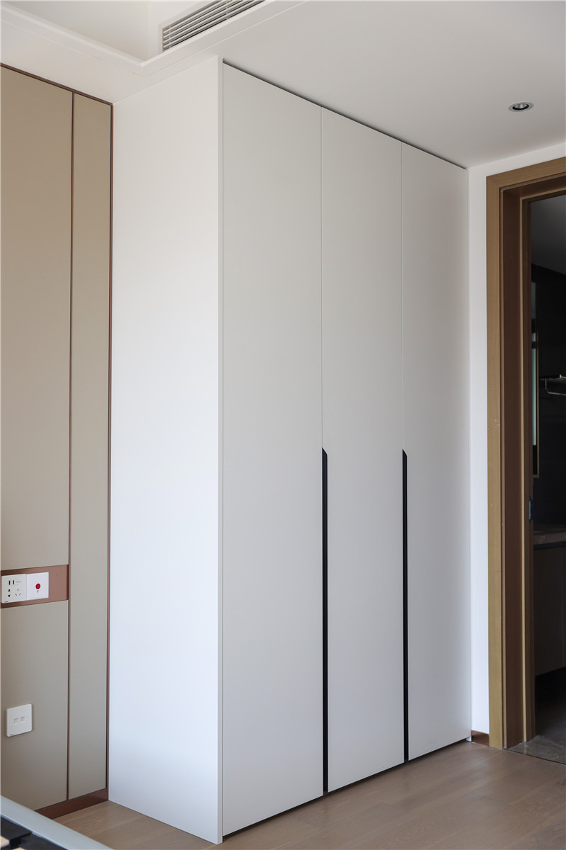 衣帽间整面到顶衣柜,芬兰白OSB柜体,质量靠谱;柜门耐磨、耐腐蚀、抗老化,美观度高;装饰性拉手为小扇子形状,门板对称,好看雅致。
