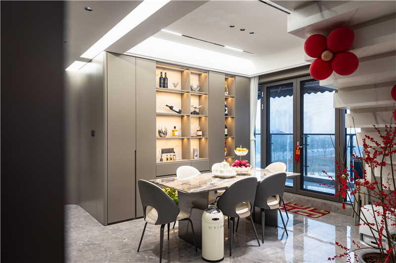 橱柜柜体以简约黑拉手配以无拉手设计,视觉上清爽利落;将烤箱、冰箱大电器嵌入高柜中,和谐布局;餐厨空间以推拉门做区隔,有效解决顽固污渍困扰,让空间更加明亮干净。