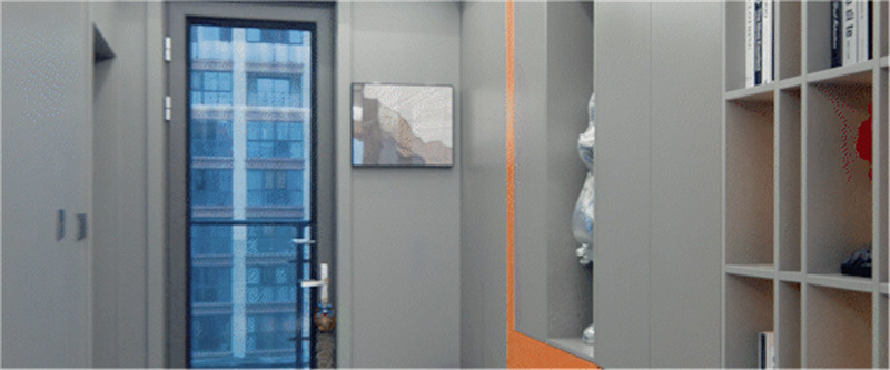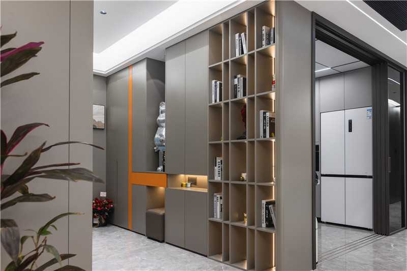 玄关柜到顶设计,充当家里的隔断,优化空间动线。整体一字型构造,以一抹橘调点色,穿插设计以设计感增强柜体美感。