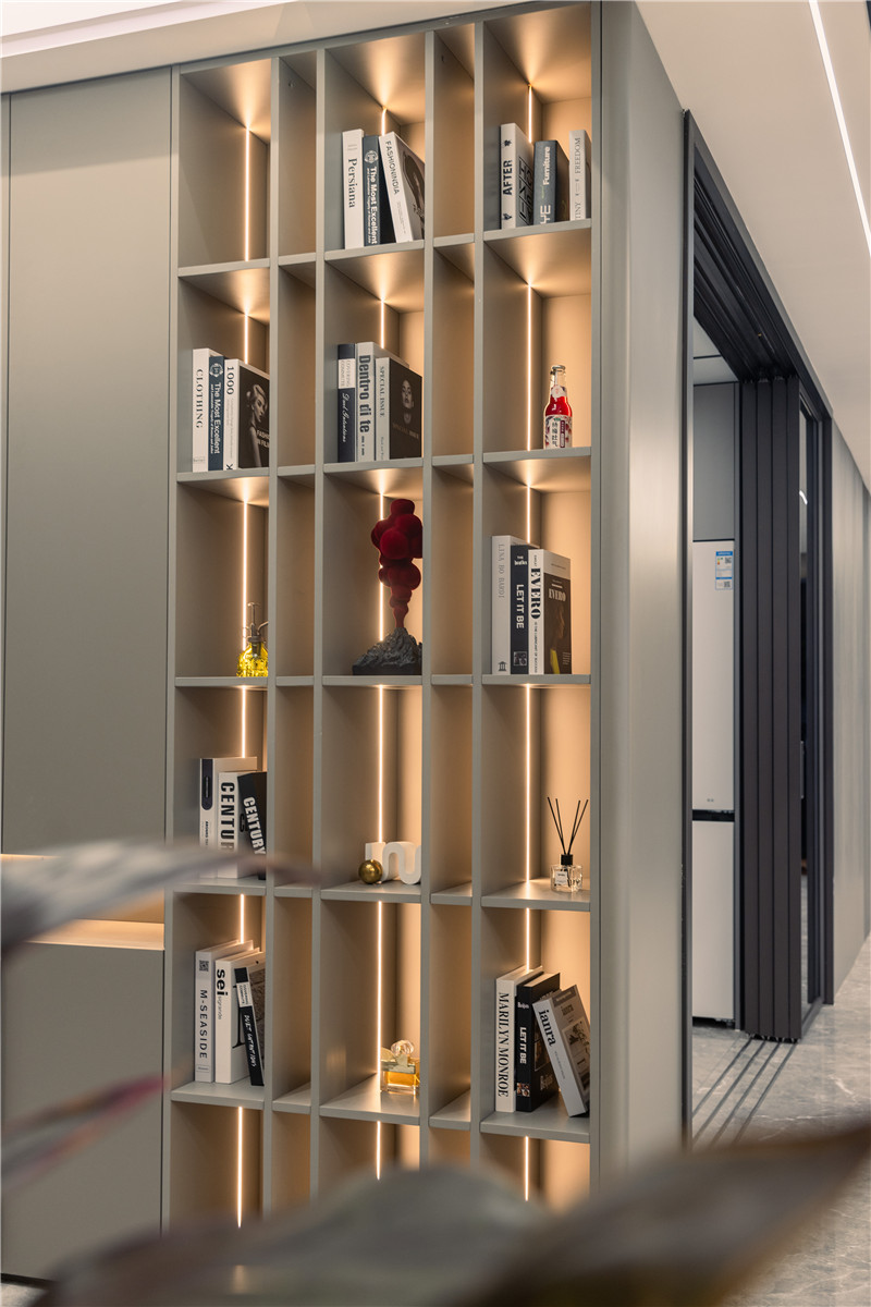 玄关柜一侧做隔层,嵌入条带灯,是装饰区、也是阅览区。