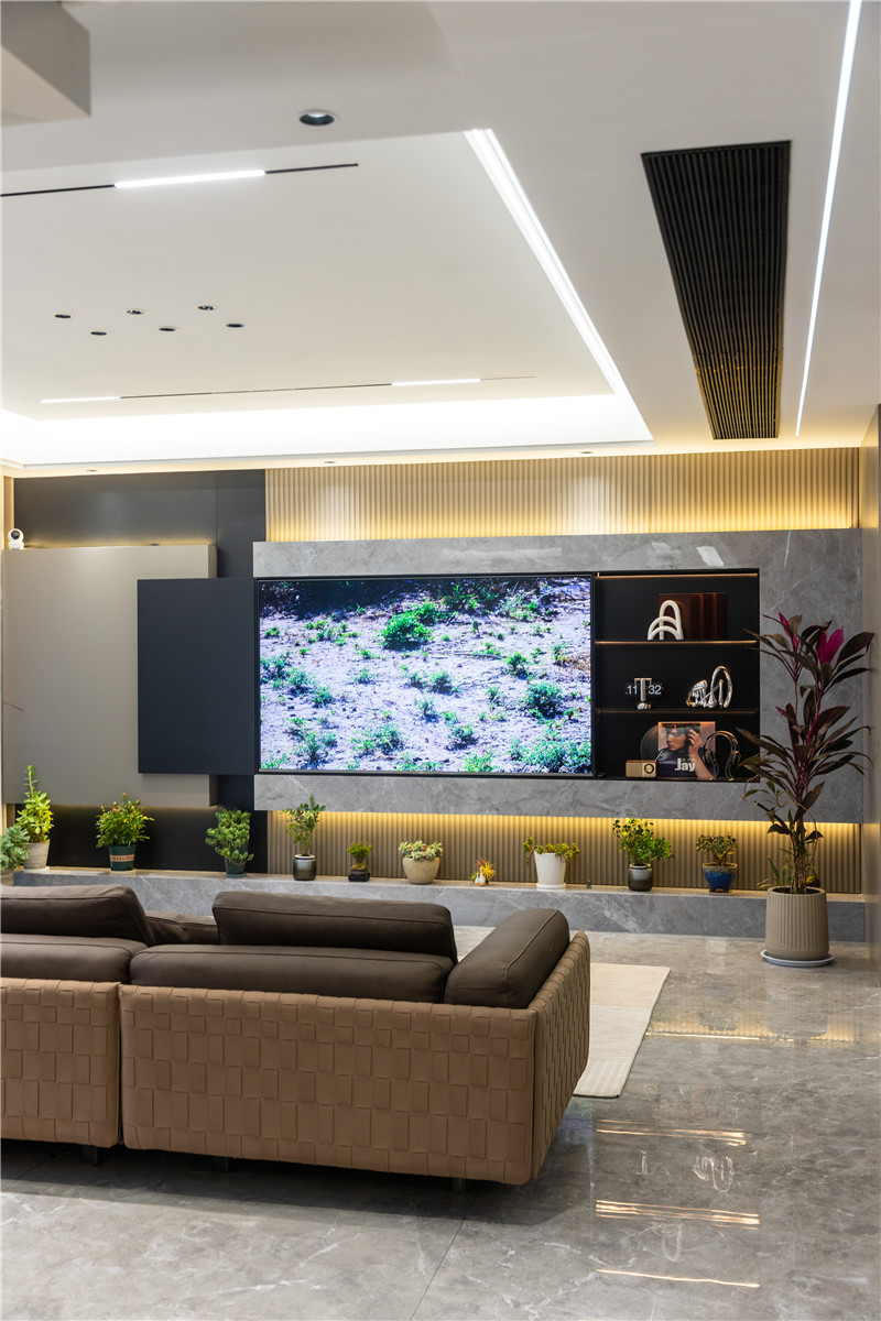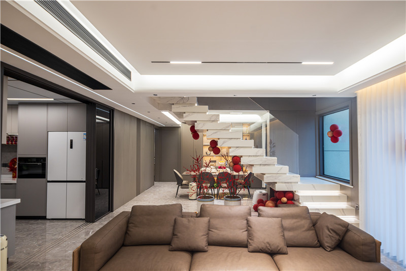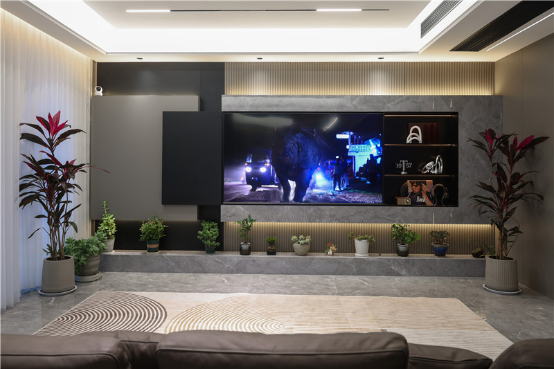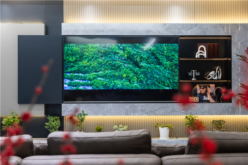 客厅高级构造,以创意、新意展现定制魅力。整体开放式设计,以无主灯设计突显空间氛围感,气质显露。