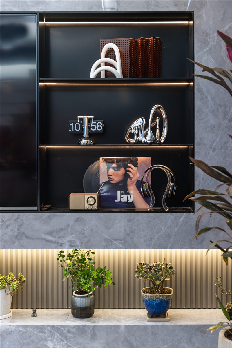 背景墙采用纵向格栅及跳色,视觉感强;大理石板、门板拼接,其挑高设计突显层次感;电视机旁侧协调装饰柜,深色调纵深感强。