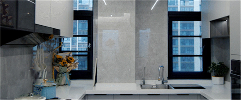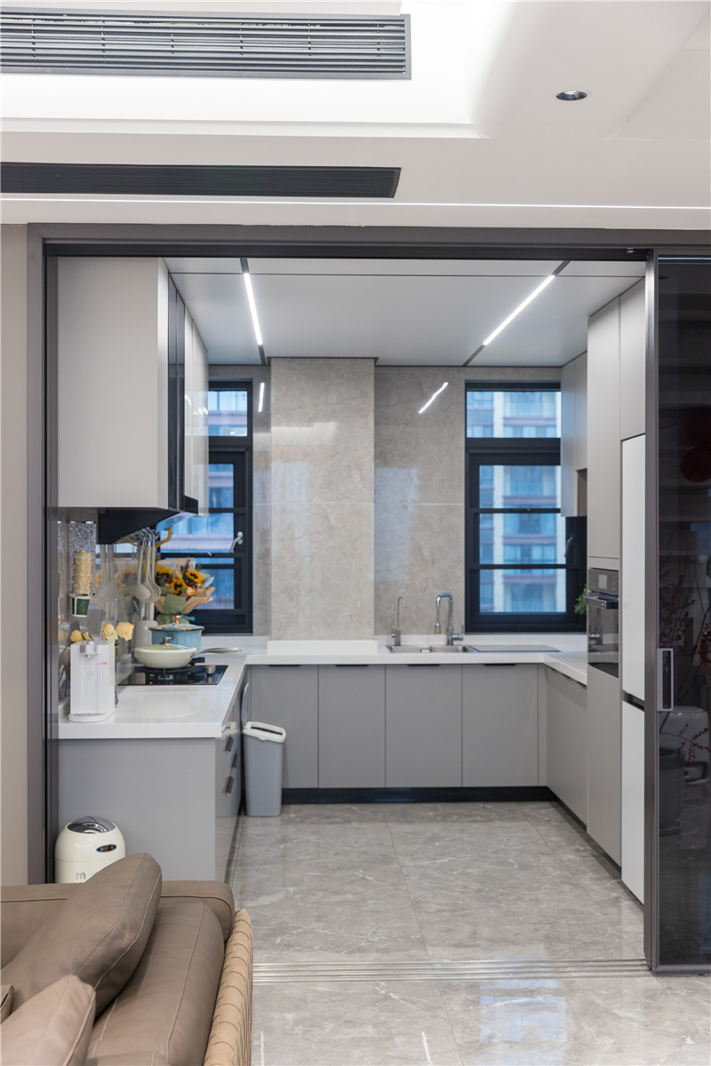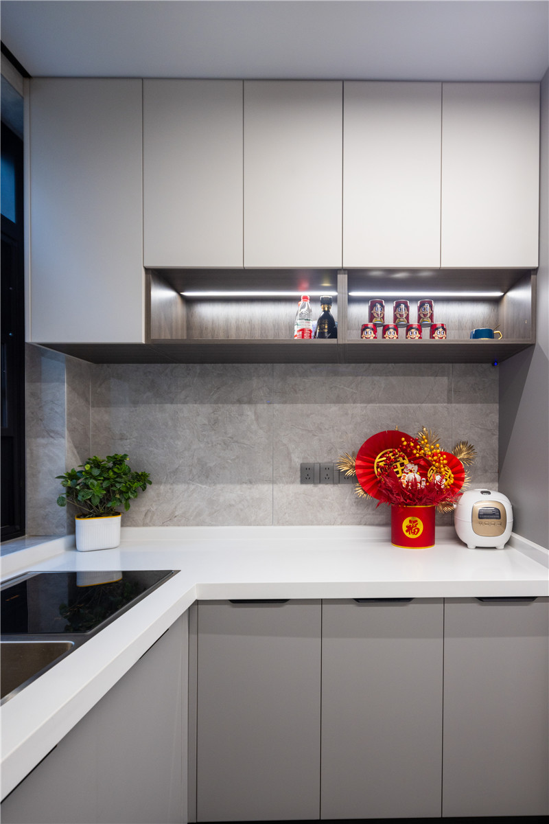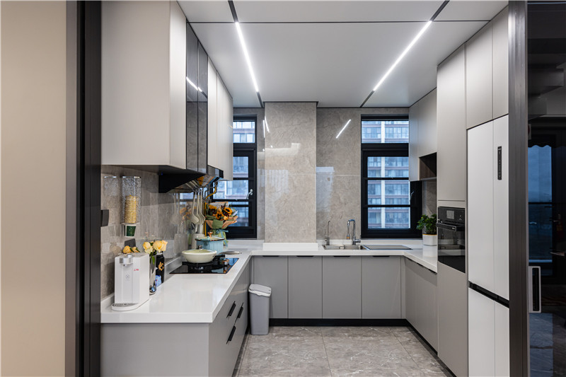 橱柜以U型构造合理利用空间,其灰调与白调配合,简约好看。洗→切→烹→盛的动线,提升美食烹饪的效率。