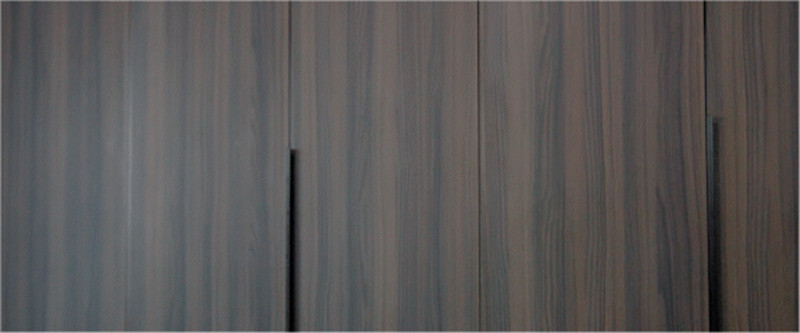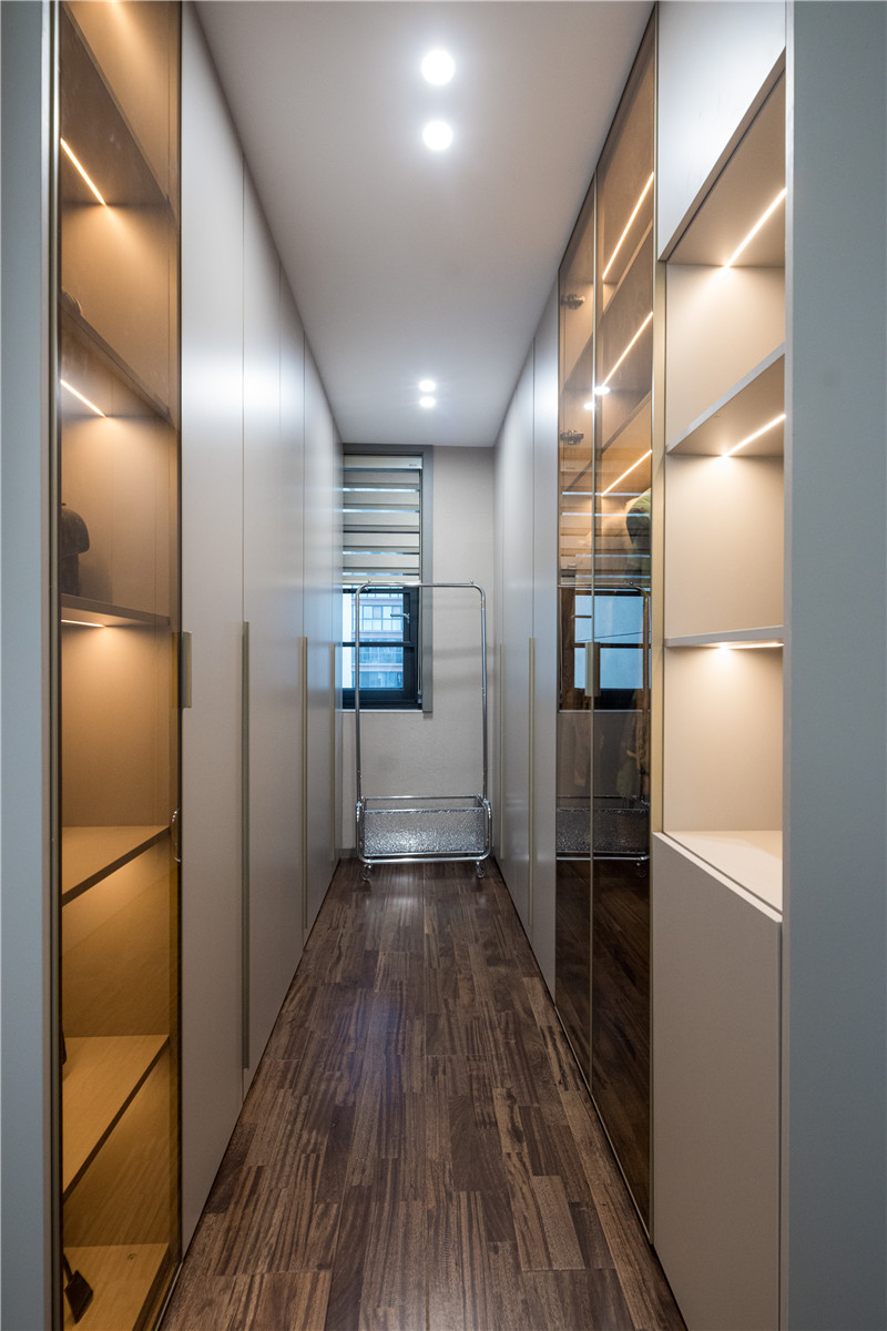卧室侧边建立小型衣帽间,II型构造有效利用狭长区域,木柜、玻璃柜、展示柜组合,以藏八露二原则展现美感,其柜金属色长短拉手配合,好看且具备实用性。