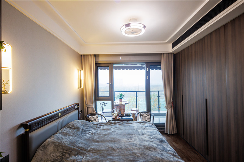 古典灯具+床头板构造彰显雅韵;独立阳台+配套茶桌椅,悠闲生活轻松实现;一字型顶天立地式衣柜,以合理分区满足屋主的多重收纳需求。