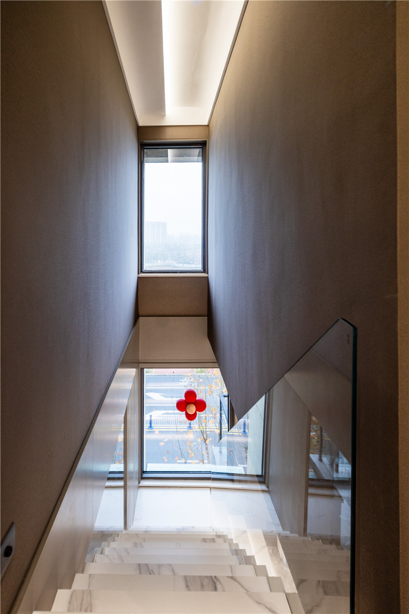 看完一楼的装修,视线向上,高级特色的悬浮楼梯展大气之势,若三五好友来家小聚,拍照打卡地就有了。楼梯做简单装饰,下置用餐区,氛围感拿捏!