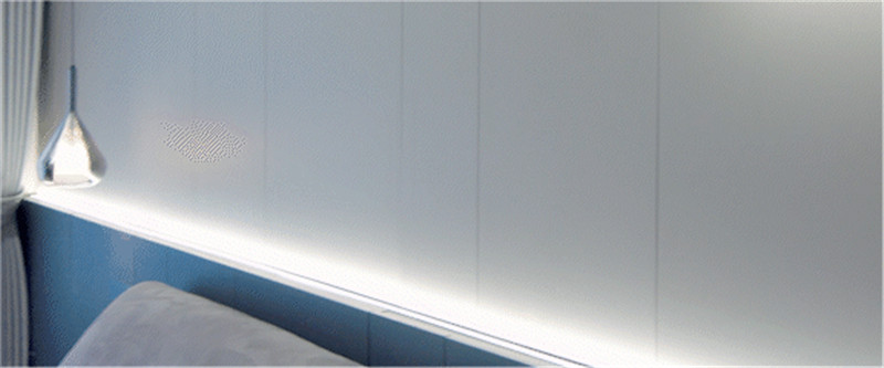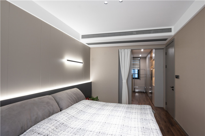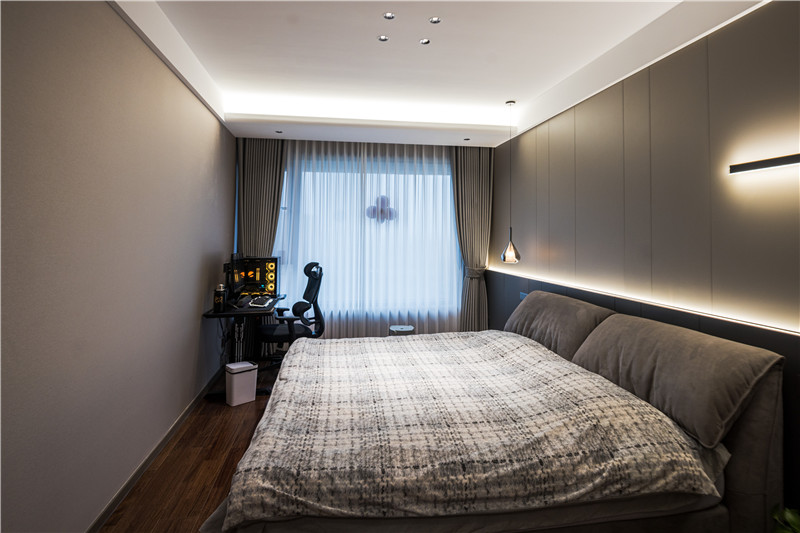 主卧床头背景墙采用拼接设计,拼接处以灯光点缀,呼应于艺术灯及局部灯光,满满氛围感。