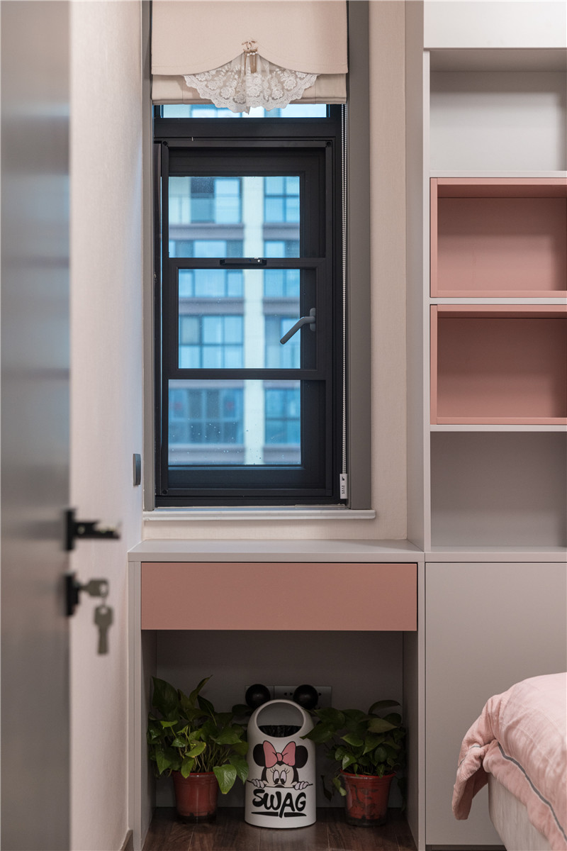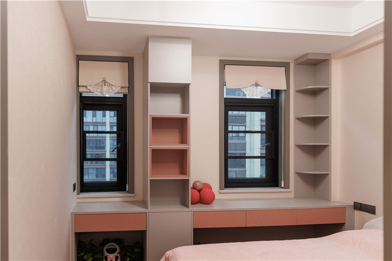 衣柜以雾霾粉作为跳色点缀,活泼灵动;靠墙圆弧展示柜,视觉柔和,是DIY区,也是小物品收纳区;抽屉及底柜无拉手、桌面高度量身定制,空间利用率高。