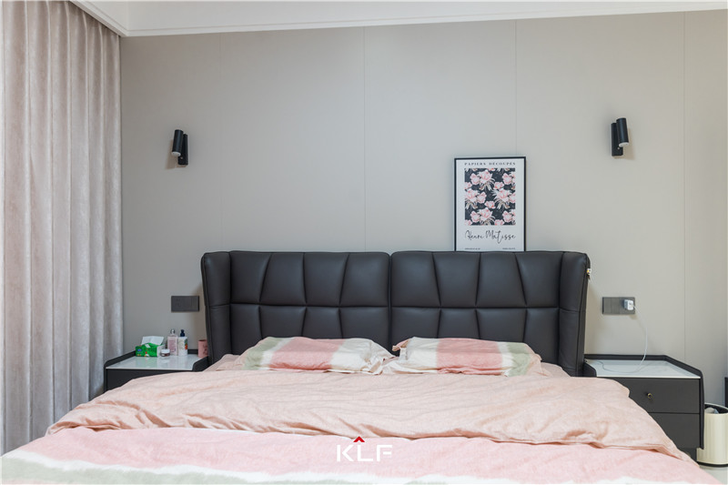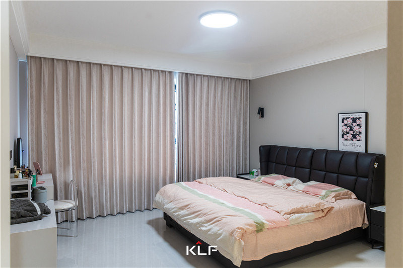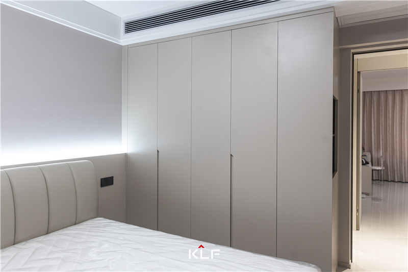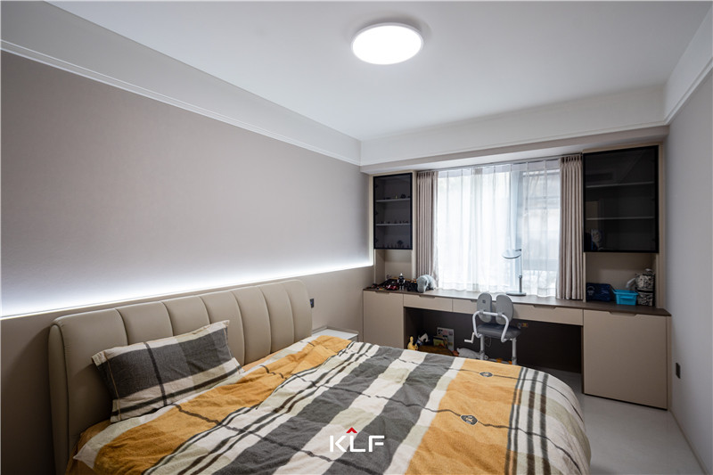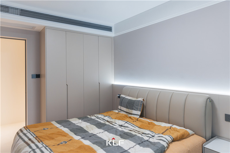 主卧以茶白调尽显柔和温润。入门到顶式立柜协调拼接式床头板、铣槽长拉手不占空间,靠窗建立小型书柜,灵活性强。
