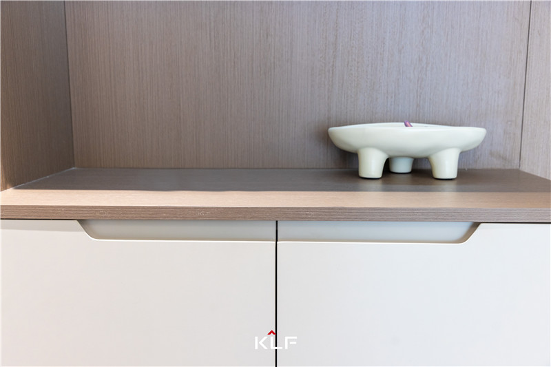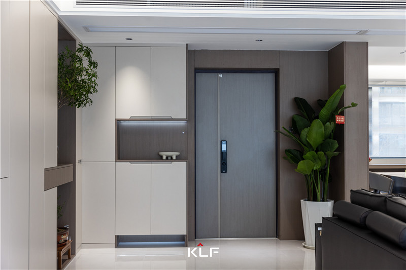 玄关中部及底部掏空,以人体工程学设计保障出入便捷度。茶白与檀木纹色彩拼接,射灯与辅助灯点缀局部,一整个实用住了。