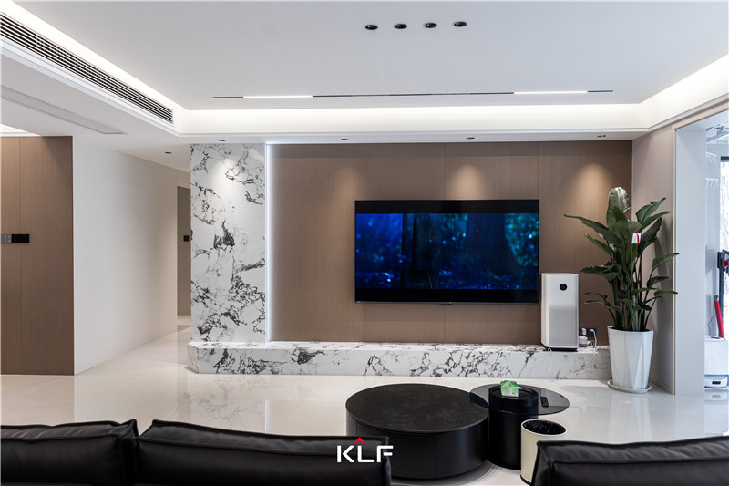 木质电视背景墙边围以大理石纹砖做突出,沙发背景墙整面立柜设计,玻璃柜、木质柜做拼接,以穿插设计、拉手造型做个性化,彰显美感。