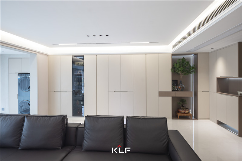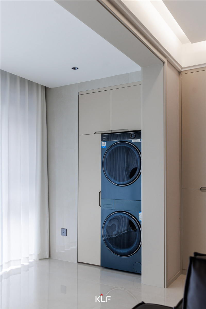阳台洗烘一体式洗衣房,整体与沙发背景墙相协调,分散家里的洗漱压力。