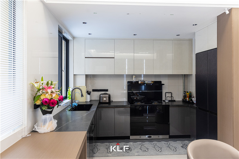 进门配套餐桌椅岩板圆弧收边,耐污防渗水的同时安全系数高。橱柜以U型构造发挥收纳存储功能,上浅下深构造、门板为亮面,易清洁打理。