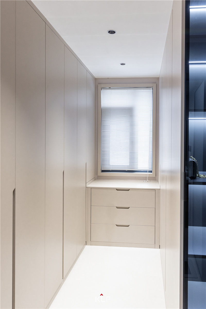 家里的狭长区域不知道怎么利用?不妨做成独立式小型衣帽间。衣柜呈U型构造,抽屉与立柜相组合,是家里的多功能房,分散存储收纳压力。