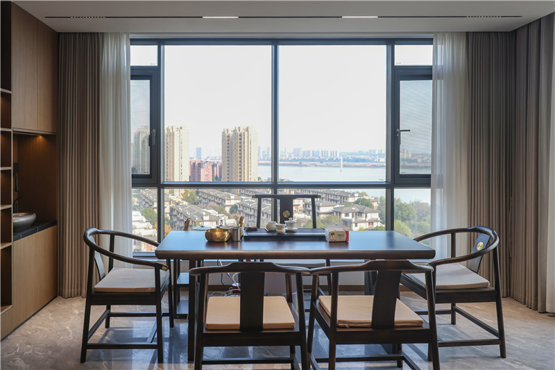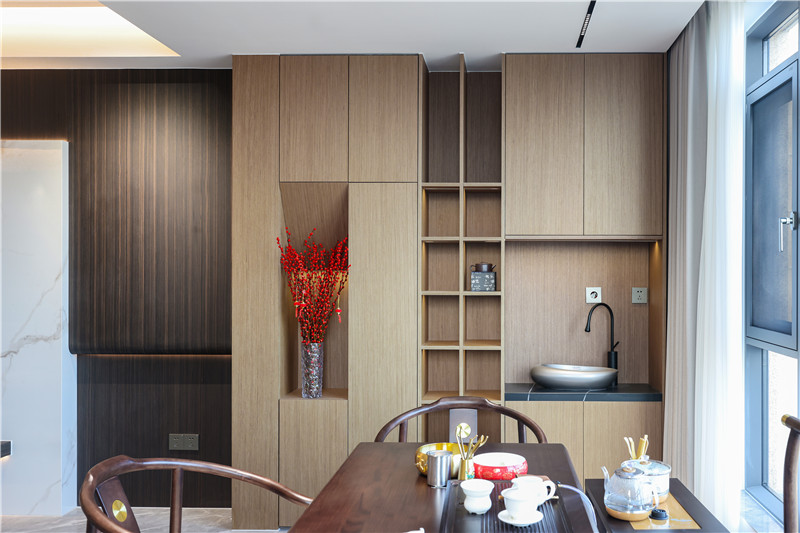 中式复古风配套桌椅,是一家人的欢笑畅聊地;靠墙柜体遵循藏八露二原则,分散家里的收纳、洗漱压力,也是家里的风景线。
