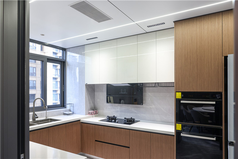 厨房米兰·(milan)橡木柜体配合以岩板,温馨柔润,其整体U型构造遵循智慧动线,实用性强;根据实际需求将烤箱等大电器嵌入地柜、高柜中,让空间有效归整。