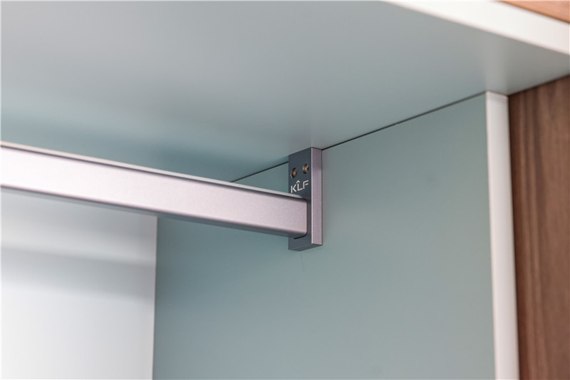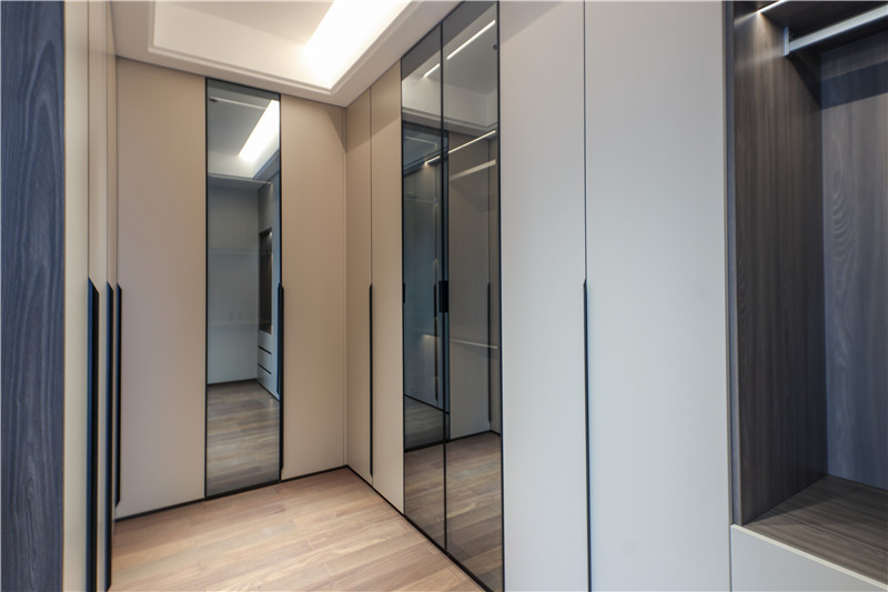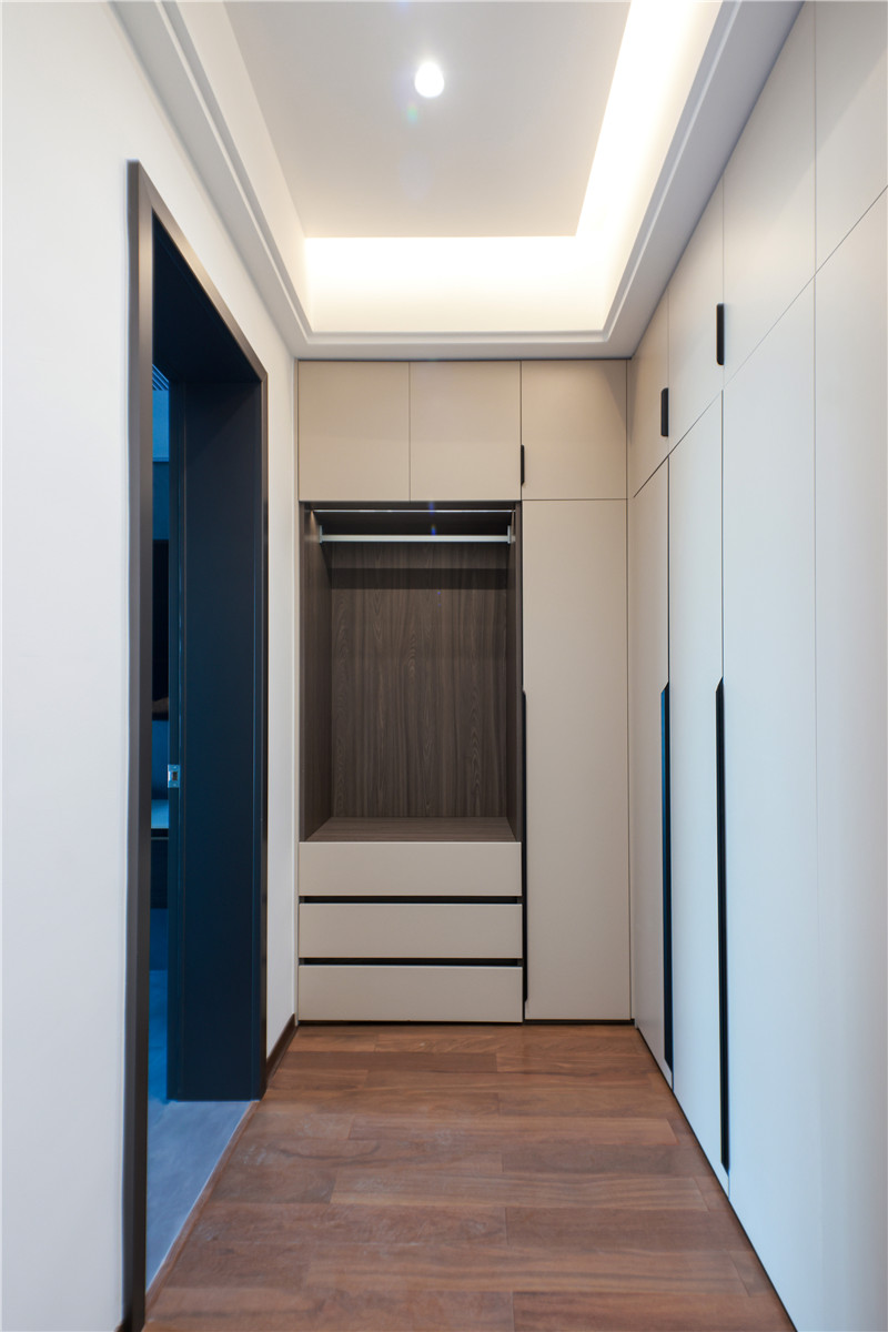 主卧内有小型衣帽间,狭长区域做到顶立柜,一侧做挂叠结合区、一侧做长柜,有效保障多重收纳与整洁需求。