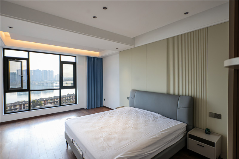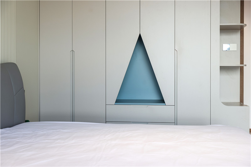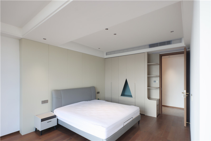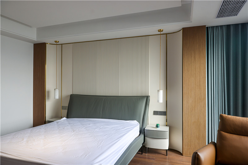 床头整包嵌入墙体协调于整屋色调,配合以细节处灯光,妥妥温居;靠窗多功能收纳柜,顶天立地式结构中和收纳和装饰功能。