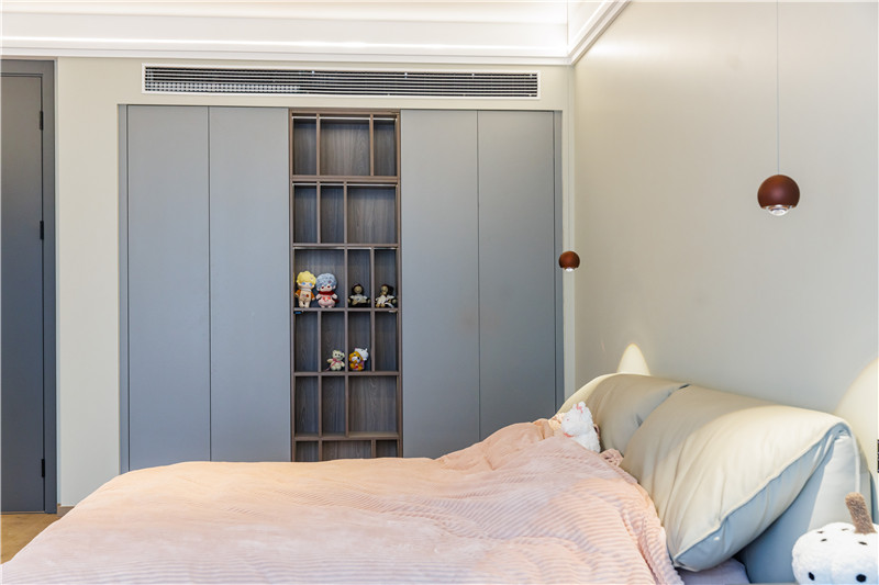 该卧室设计中部不规则开放柜,放置日常玩偶、手办、模型等收藏品,符合使用者所需,同时为衣柜增加了精致与颜值。