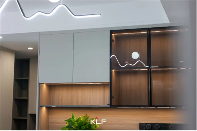 在餐厅与卫生间的区域间以一组隔断柜去进行空间美化,穿插的设计手法以抽屉分隔整个高柜,整体尺寸更加协调,中部加入长虹玻璃的设计可以搭配绿植或是手办摆件,整体会更精致。