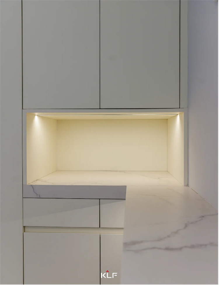 餐边柜收起生活的繁杂,还原高端定制的有序与雅致。设计师延伸柜体转角后在地柜上留了一个西厨的操作台,中西厨结合,包容每一位家人的饮食习惯,让用餐与烹饪自成一体,倾情享受他们的“食光”。